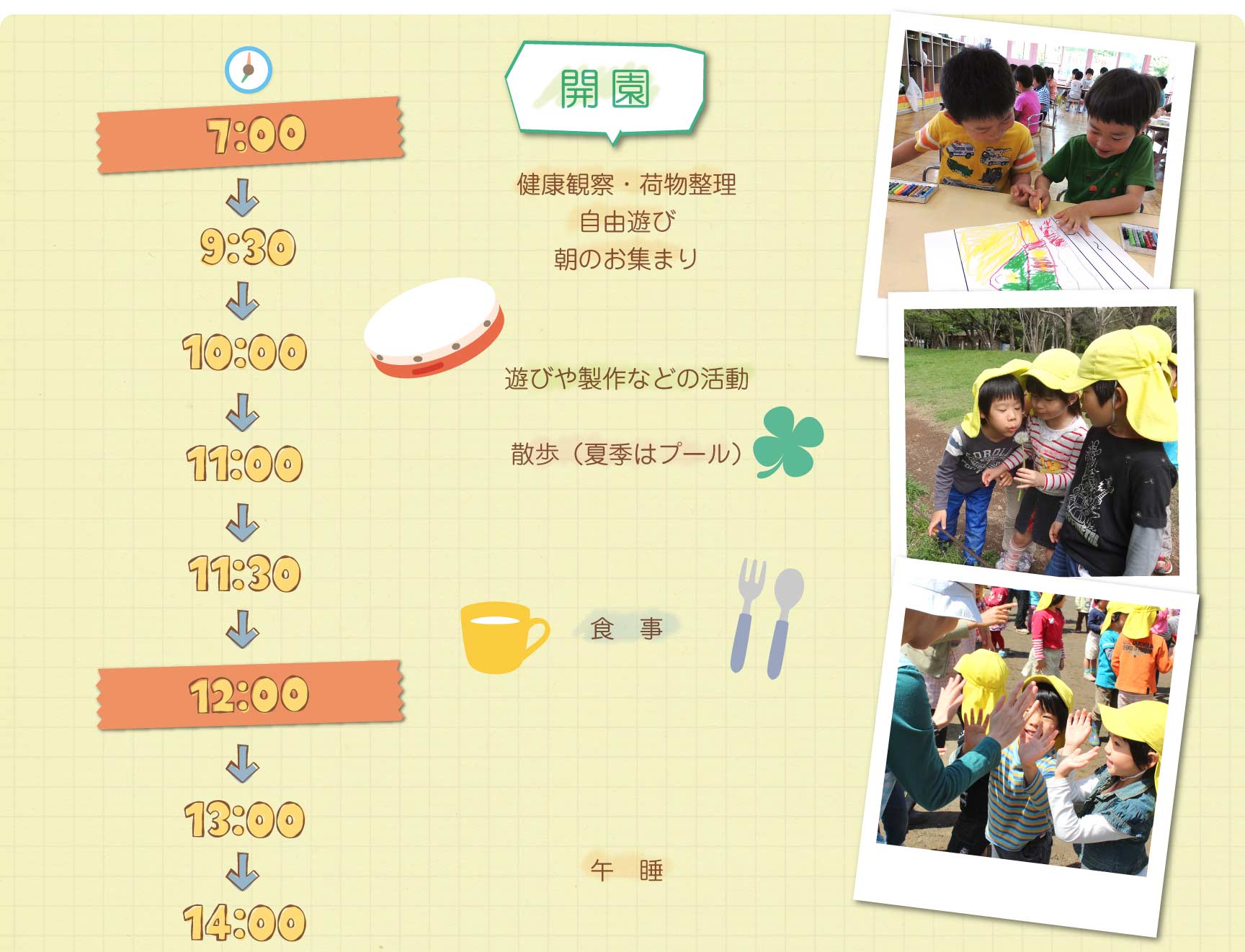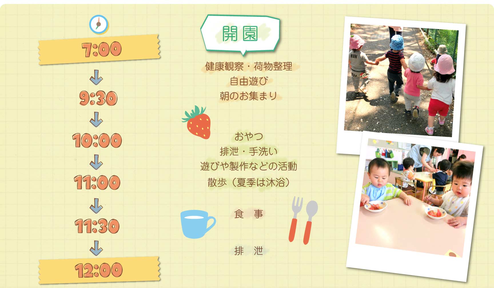【保育標準時間認定】7:00〜18:00(月曜日~土曜日)